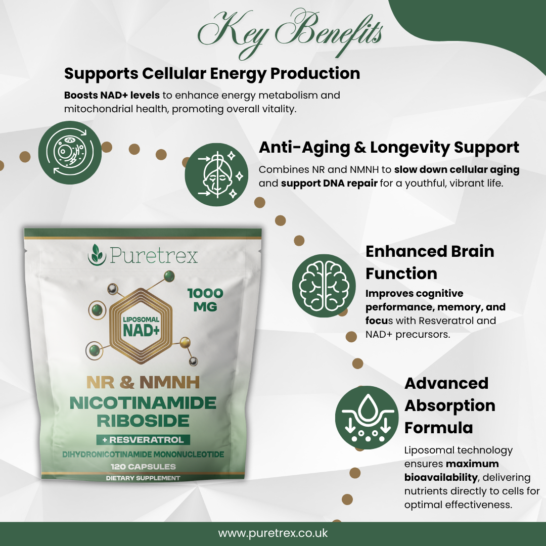 PURETREX NAD+ Liposomal NR & NMNH Complex is a next-generation supplement designed with advanced liposomal delivery for maximum absorption. Each serving provides a powerful blend of Nicotinamide Riboside (NR), NMNH, Resveratrol, Quercetin, Fisetin, Astaxanthin and CoQ10, offering a highly synergistic formula. The product comes in vegan capsules, is non-GMO, gluten-free, and manufactured in the UK to the highest quality standards. Perfect for those who want a premium, clean and science-driven supplement to support their wellness routine.