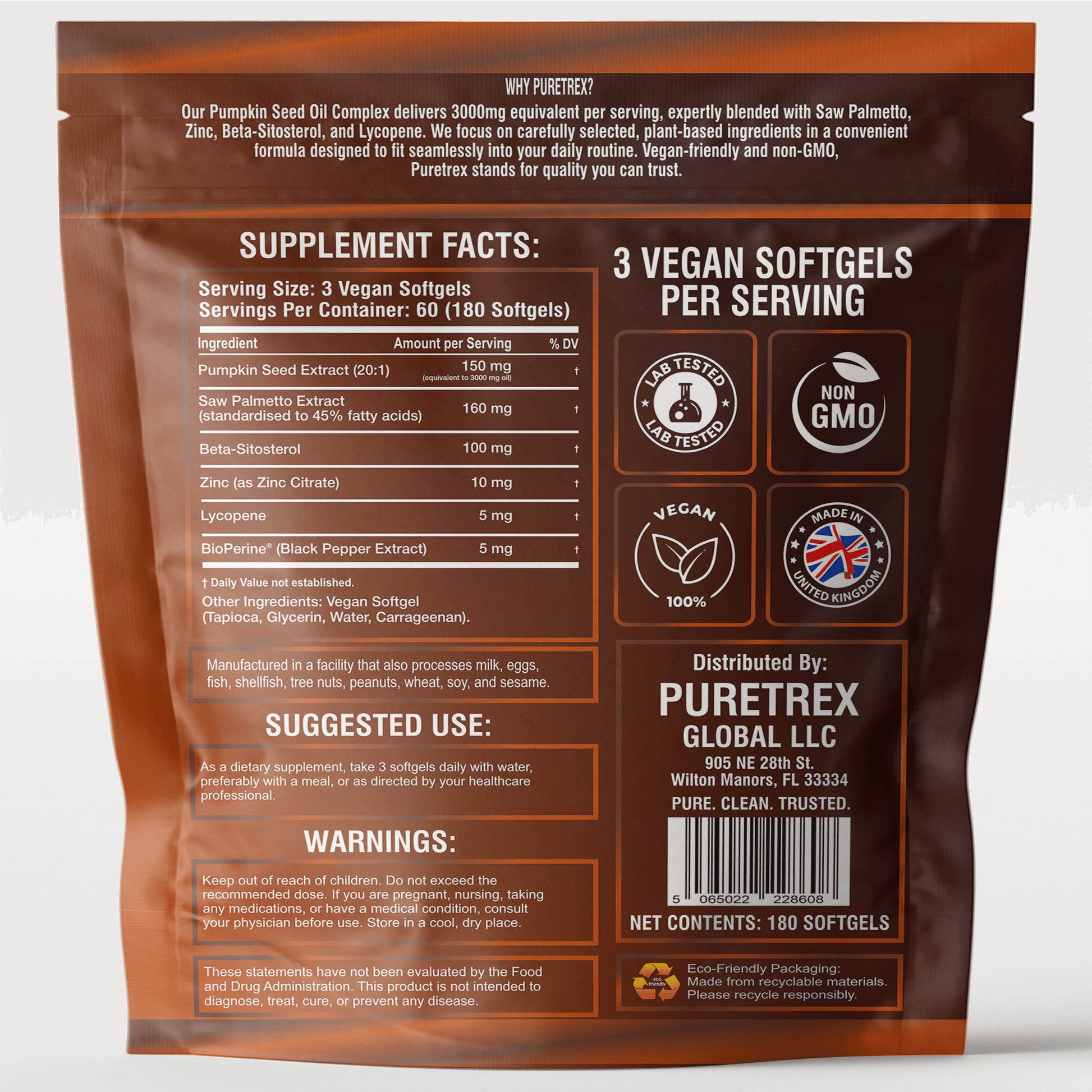 PURETREX Pumpkin Seed Oil Complex delivers 3000mg pumpkin seed oil equivalent per serving, expertly blended with saw palmetto extract, beta-sitosterol, zinc, lycopene, and BioPerine. Made with carefully selected, plant-based ingredients in convenient vegan softgels, this formula is crafted for quality, purity, and consistency. Vegan-friendly and non-GMO, produced in the UK under strict standards.