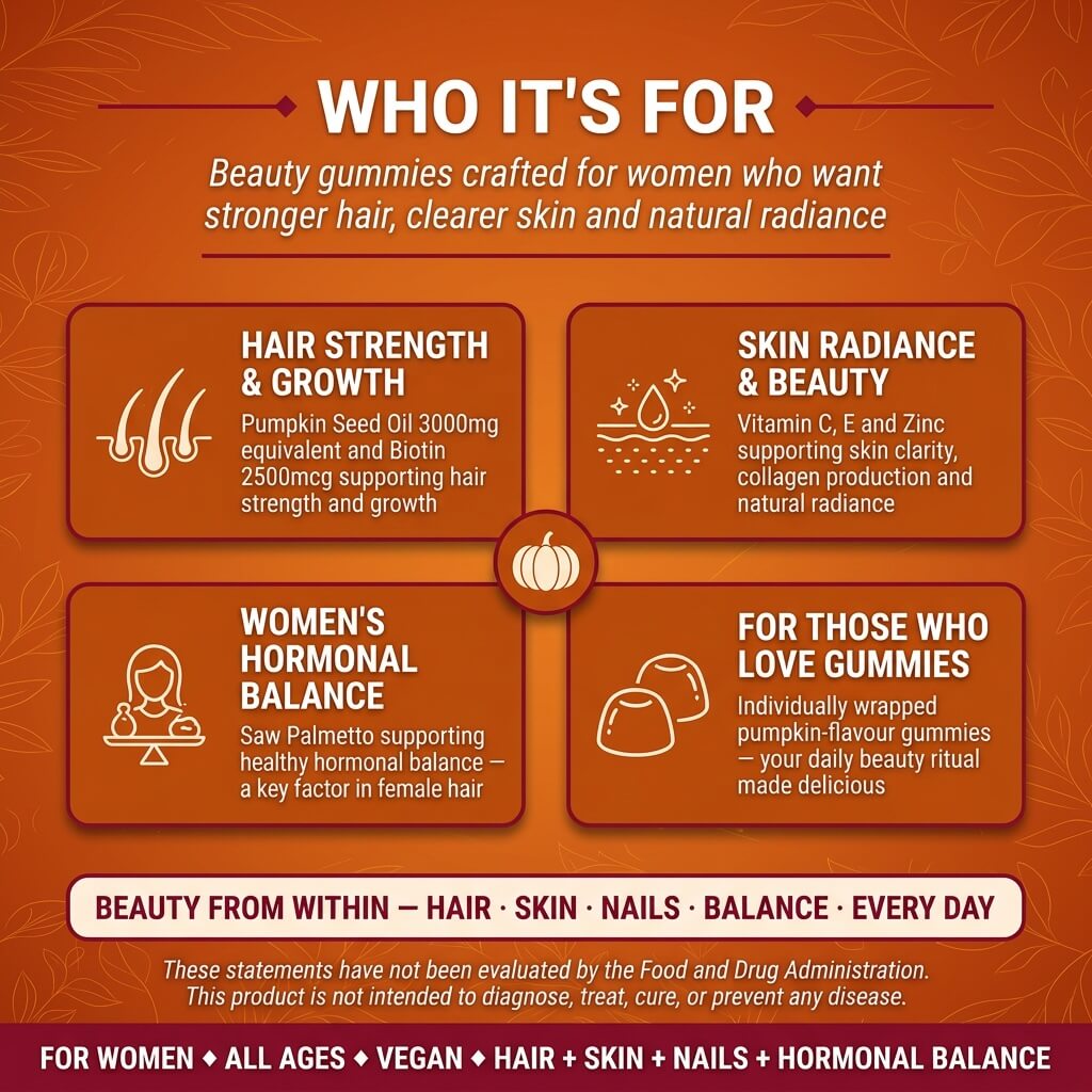 Pumpkin Seed Oil Extract 10:1 (3000mg equivalent) + Saw Palmetto + Biotin 2500mcg + Vitamin C + Vitamin E + Zinc Citrate + Cranberry Extract. Pectin-based vegan gummy. Individually wrapped for freshness. Natural pumpkin flavour.